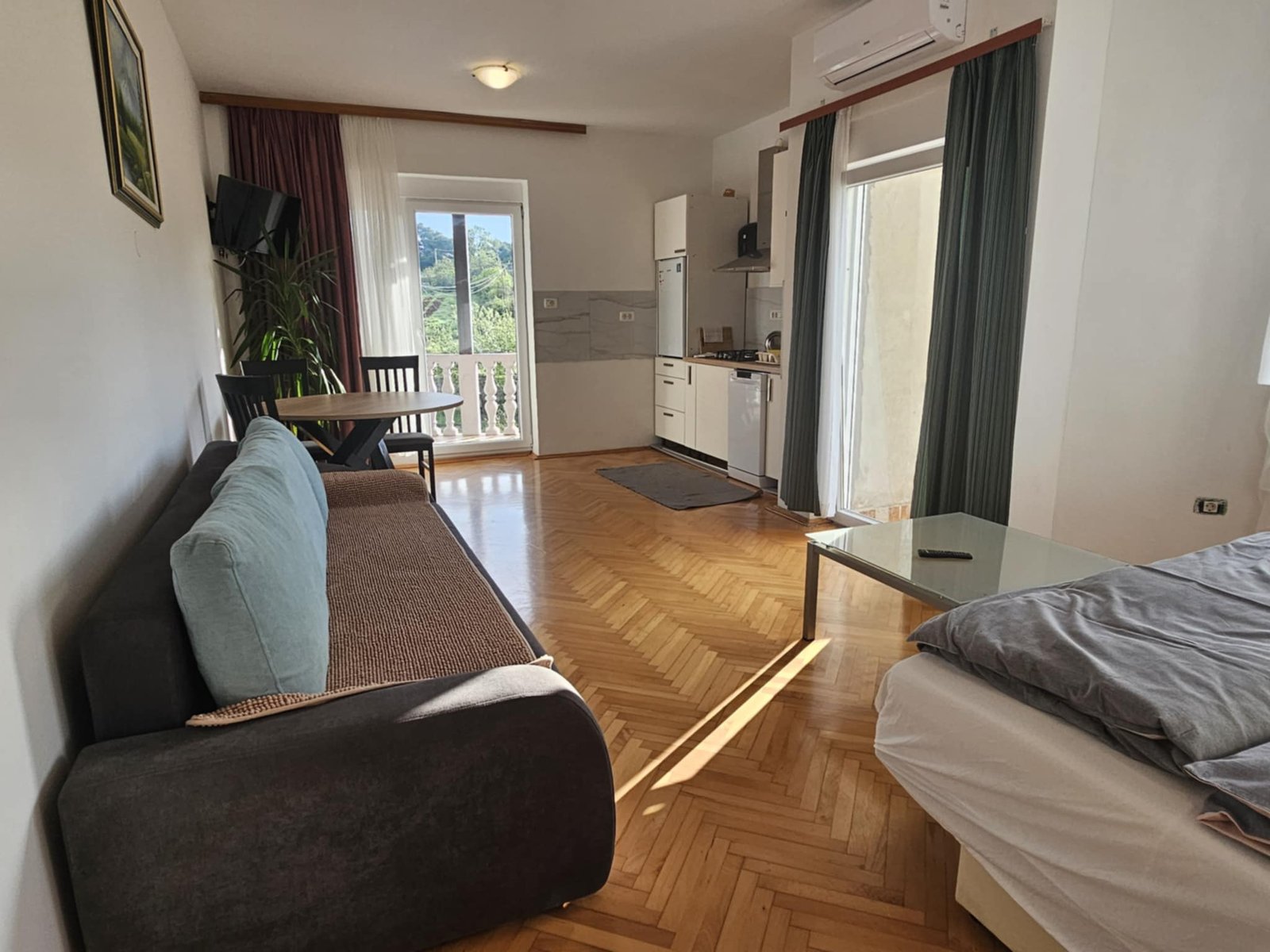 This one-bedroom apartment is located on the first floor of the Villa within the Seherezada housing complex. It has an open plan living furnished with a sofa bed (for two), TV, aircon, dining table, and a kitchen with a stove, fridge, and freezer. The bedroom has a queen size bed (160/200 cm). The bathroom is featured with a shower and a toilette.  The balcony has a beautiful view of surrounding nature and the pool. Free Internet and parking are available. Bed linen and towels are included in the price. Seherezada housing complex consists of one villa and two additional houses located in a quiet and peaceful area away from traffic noise, with a large 5000m2 yard surrounded by beautiful, wild and unspoiled nature, ideal for relaxation. Available within the complex is a gym, a basketball/volleyball court and children’s playground, an outside kitchen with a possibility of ordering breakfast and other meals. Also, the complex has a big swimming pool with sea water and a closed heated spa.